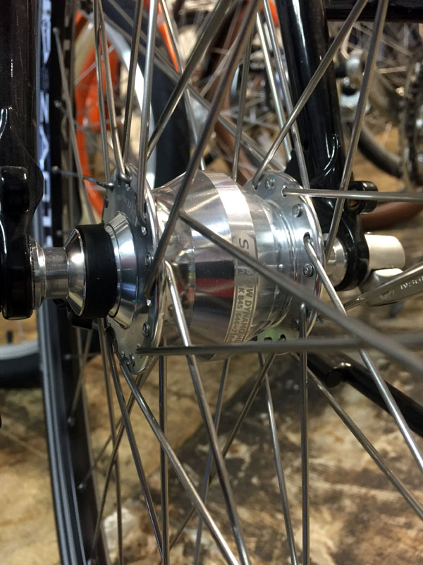 - A closeup view of the SP-PV8 Dynamo hub. Generates 6 volts and 3 watts of power.