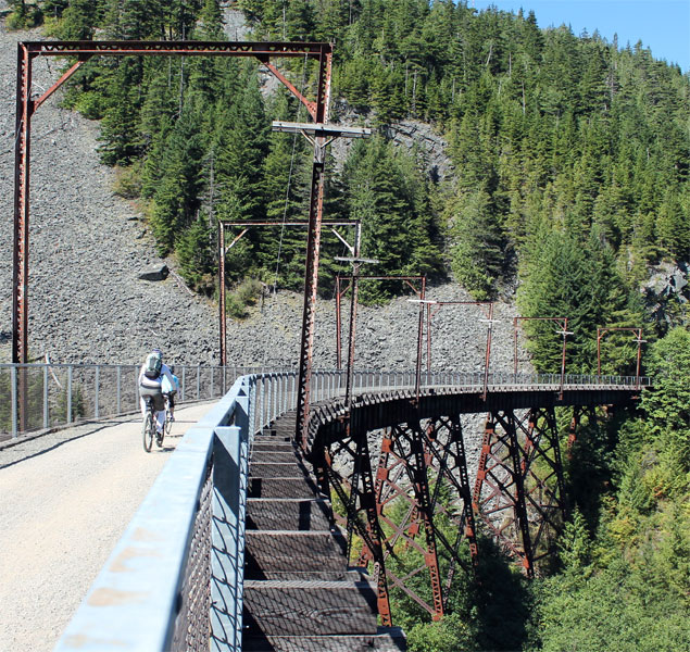 The following photos are courtesy of Gene Bisbee. He was kind enough to share scenes from his many bike journey’s along the John Wayne Trail. Gene runs an excellent biking blog about the Pacific Northwest area ( http://www.bikingbis.com ). I appreciate his generosity in sharing his photos so that everyone can get a feel for the trail we will be riding in early October 2016.